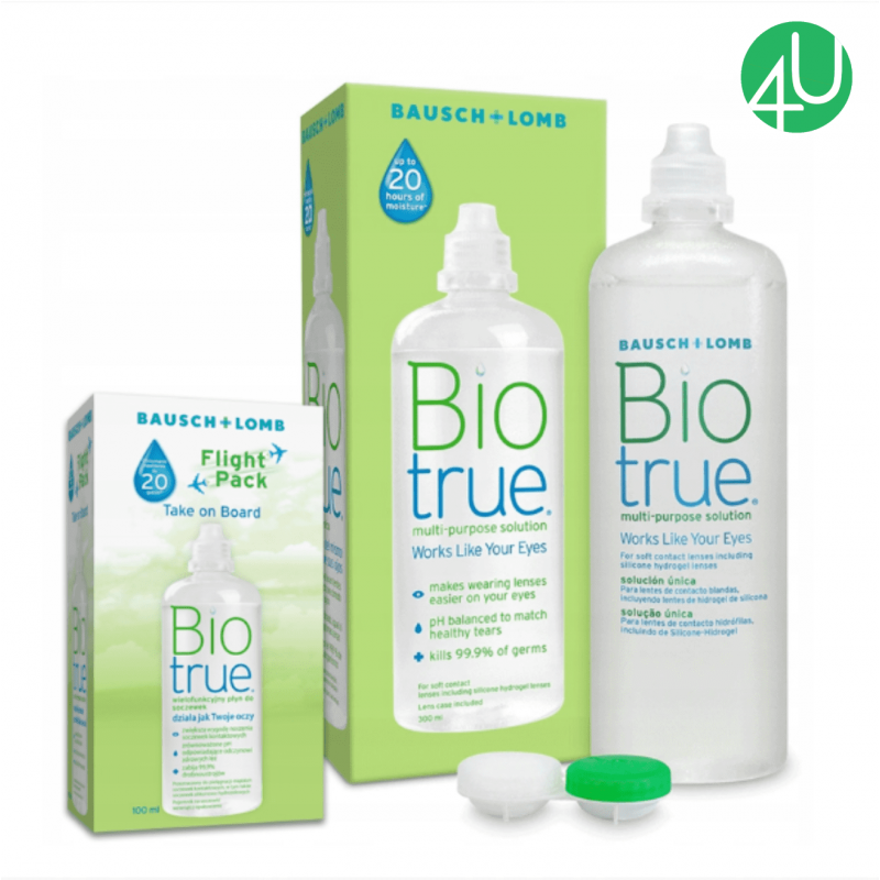 Biotrue — багатофункціональний розчин з гіалуроновою кислотою для чутливих і схильних до алергії очей. Функції: очищення, дезінфекція, ополіскування, видалення відкладень, кондиціювання та зберігання контактних лінз.